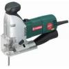 Lebensdauer Robuste Getriebe- und Motorauslegung für harte Arbeitseinsätze Verschleißfestes Aluminiumdruckguß-Getriebegehäuse mit guter Wärmeableitung zum Schutz vor Überhitzung Abschaltkohlebürsten verhindern, daß bei abgenutzten Bürsten der Kollektor beschädigt wird. Leistung und Arbeitsgeschwindigkeit Besonders geeignet für große Materialdicken: 105 mm in Holz Niedrig liegende Sägeblatt-Stützrolle mit Führungsnut - für besonders exakte Schnitte Schnellarretierung der Führungsplatte für Schrägschnitte mit den Winkelstellungen 15, 30 und 45° Metabo "Quick" - Sägeblatt-Schnellwechsel ohne Schlüssel Vario-Constamatic (VC)-Vollwellenelektronik - für anwendungsspezifische Anpassung der Hubzahl 5-stufig einstellbarer Pendelhub für besonders hohe Schnittleistung und gute Kurvengängigkeit Spanreißschutz in der Führungsplatte für ausrißfreie Schnittkanten Drehmoment 7 Nm Bedienung und Ergonomie Optimale Handhabung durch ergonomisches Design der Gerätekapsel Hochschiebbarer Greifschutz und Schutzglas - zum Schutz des Anwenders vor unbeabsichtigtem Berühren des Sägeblattes Hohe Absaugleistung durch speziellen Absaugstutzen Depot für Sechskantschlüssel Blaseinrichtung für freie Sicht auf die Schnittstelle Extra glatte Fußplattenoberfläche verhindert das Zerkratzen von empfindlichen Werkstückoberflächen Kann zur ortsfesten Verwendung in den Metabo Sägetisch 34 810 eingebaut werden. Lange schnurgerade Schnitte mit der Führungsschiene 31250 Vergleichbare Gerätekennwerte Größte Materialdicke Holz 105 mm NE-Metalle 30 mm Stahlblech 10 mm Hubzahl bei Leerlauf 1000-3000 min-1 Nennaufnahme 710 Watt Abgabeleistung 440 Watt Maschinengewicht 2,5 kg